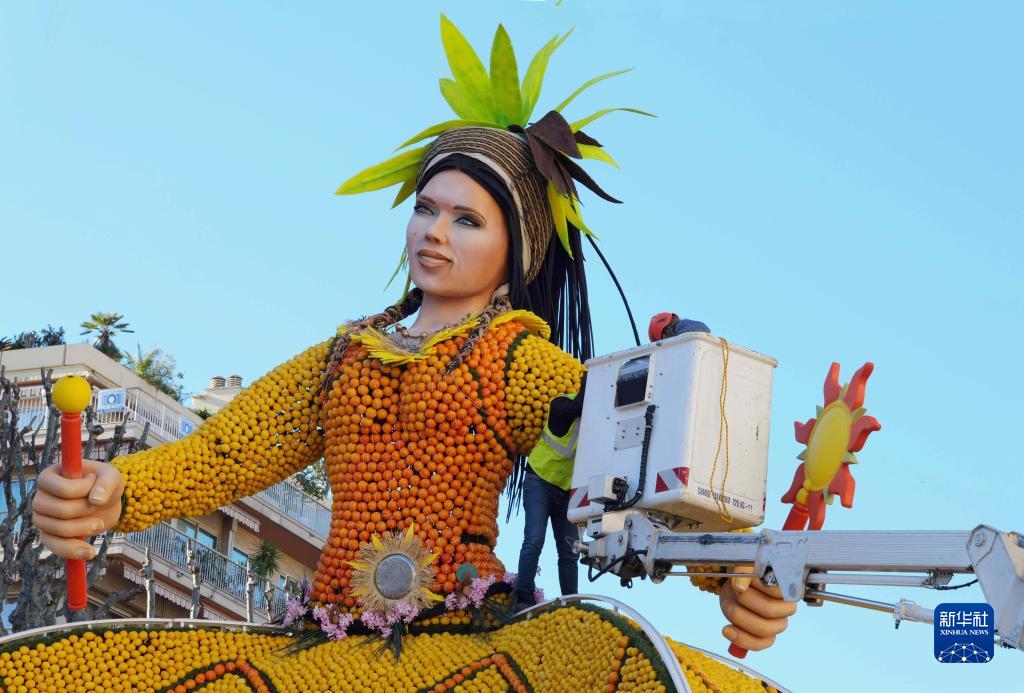 2月9日,工作人員在法國南部小城芒通裝飾檸檬節藝術裝置。