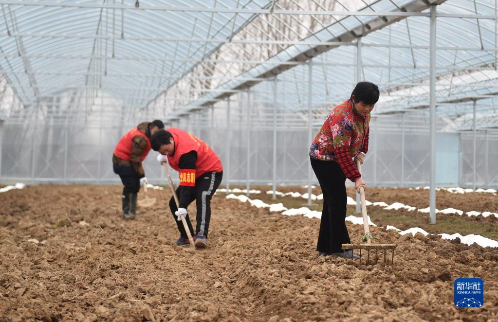 2月11日,在安徽省合肥市廬陽區大楊鎮十張村一農業大棚,黨員志愿者幫助農民進行西瓜地開溝起壟。