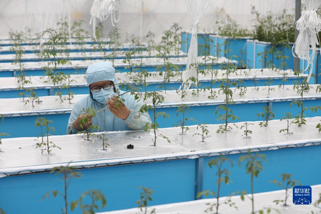 2月11日,在安徽省合肥市蜀山區南崗鎮一處無土栽培大棚里,技術人員在觀察蔬菜的長勢。