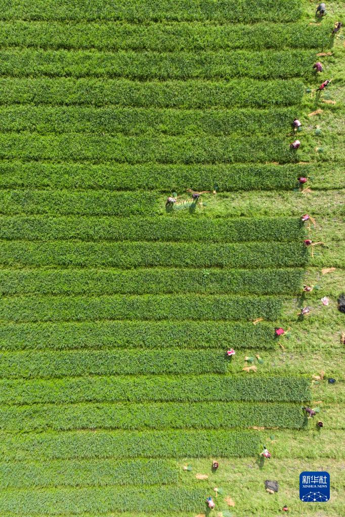 2月11日,四川省內江市東興區田家鎮火花村村民在采收蒜苗(無人機照片)。