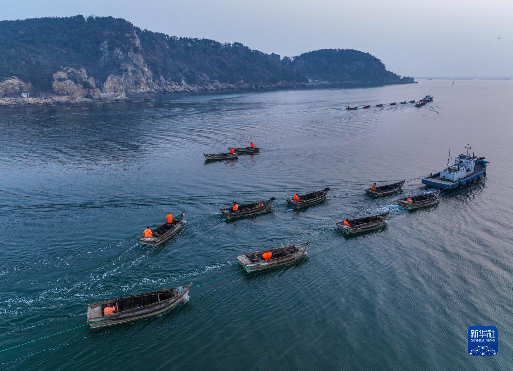 2月11日,在山東省榮成市俚島灣畔,漁民們駕駛著各類漁船舢舨前往養殖海區作業(無人機照片)。