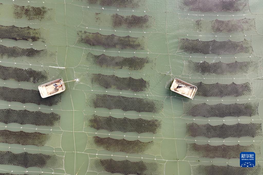 2月10日,江蘇省連云港市贛榆區沿海紫菜養殖戶在管理紫菜(無人機拍攝)。