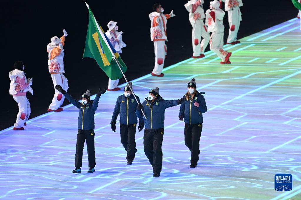 在國家體育場,雅克利娜·莫朗(左一)作為巴西代表團旗手之一參加北京冬奧會開幕式。新華社記者 黃宗治 攝