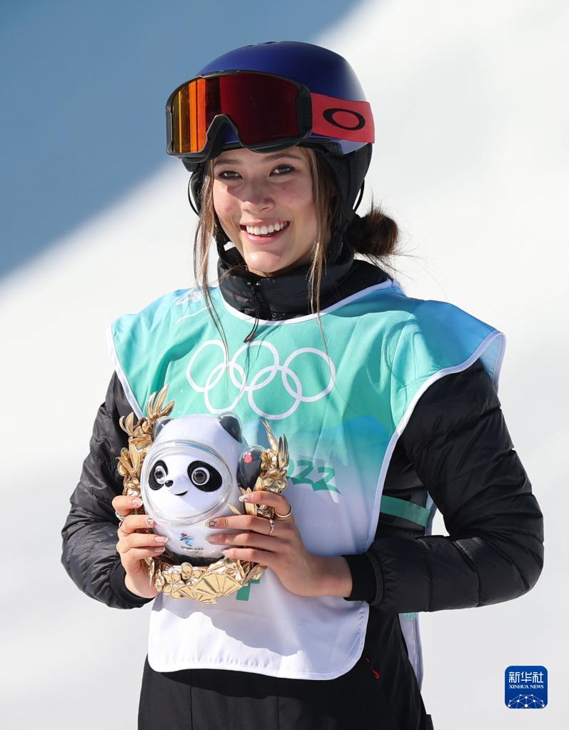 2月8日,自由式滑雪女子大跳臺比賽冠軍、中國選手谷愛凌在頒發紀念品儀式上。新華社記者 丁旭 攝