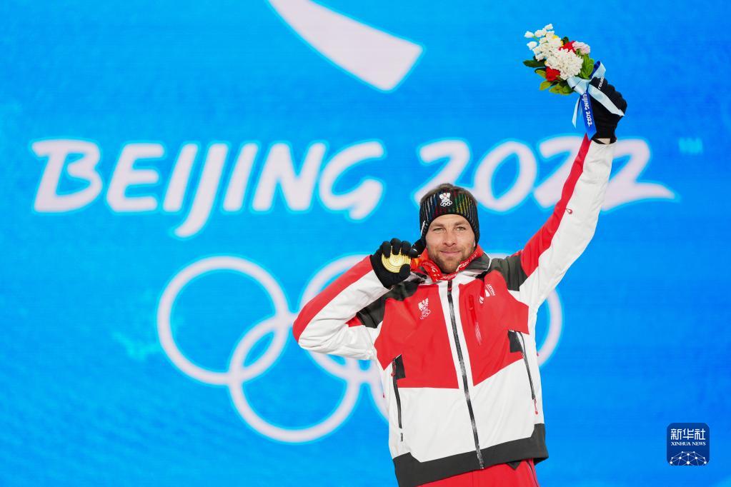 2月8日,單板滑雪男子平行大回轉比賽冠軍、奧地利選手本亞明·卡爾在獎牌頒發儀式上。新華社記者 朱崢 攝