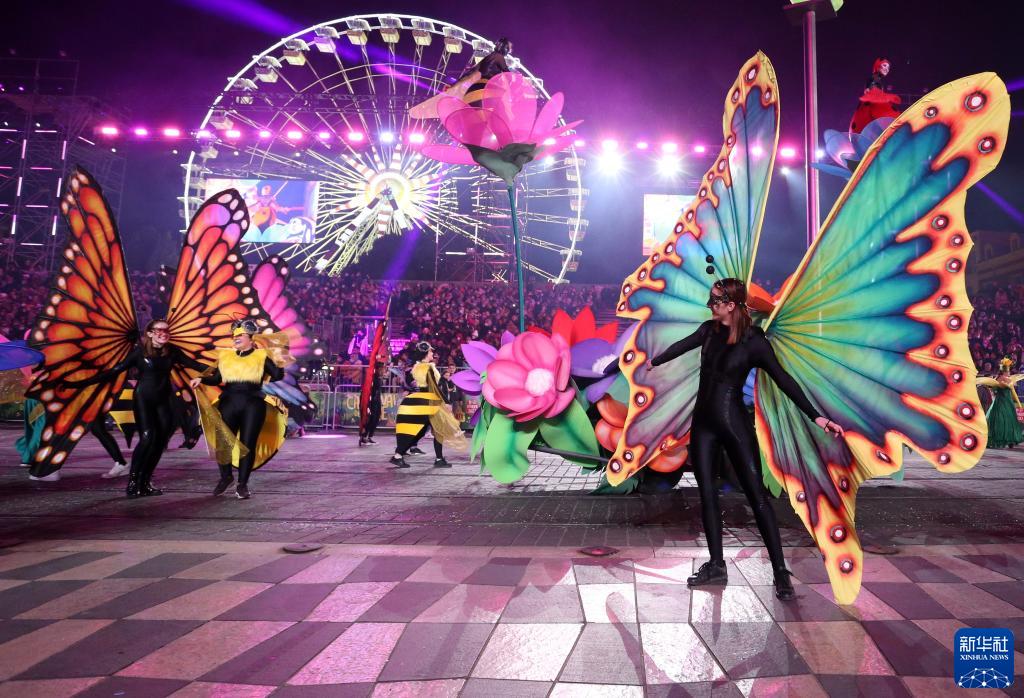 這是2月12日在法國南部城市尼斯拍攝的狂歡節花車夜間游行現場。