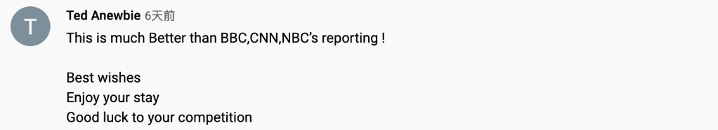 索魯普的視頻日記在海外社交媒體平臺播發后,引發不少網友對北京冬奧會的關注。有網友留言說:“這比BBC、CNN、NBC的報道強多了?!?/p>