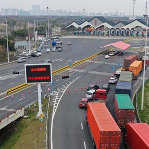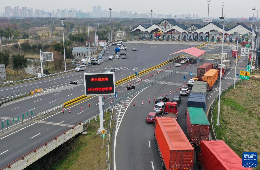 2月15日,車輛在京滬高速公路蘇州新區收費站接受查驗(無人機照片)。