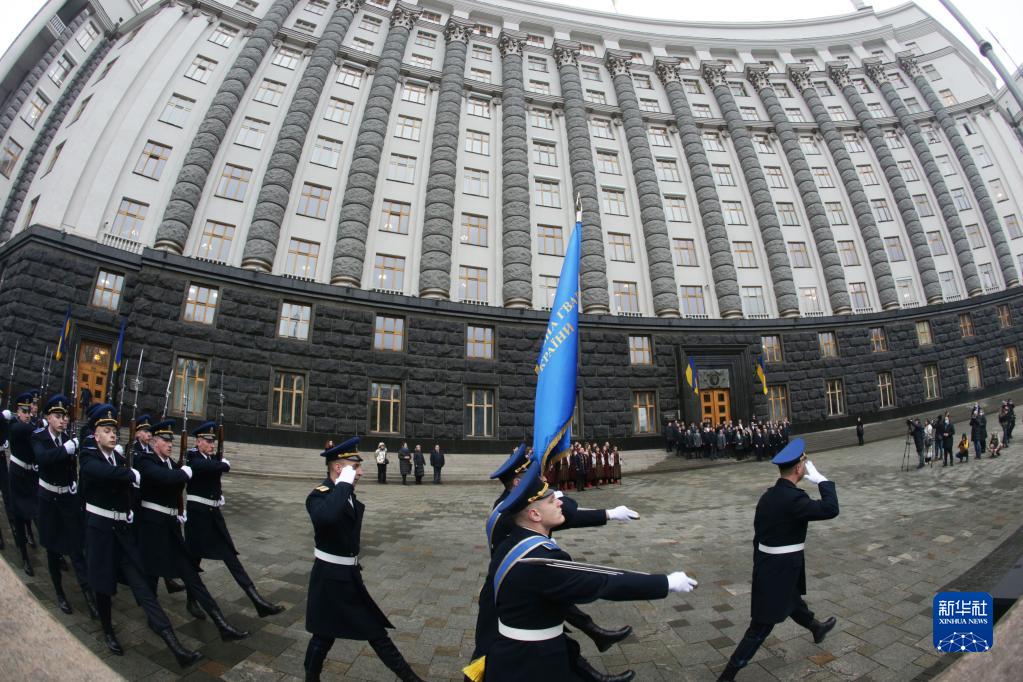2月16日,在烏克蘭首都基輔,烏國民衛隊儀仗隊行進至烏克蘭政府辦公大樓。