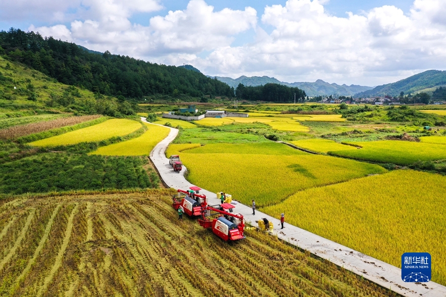 2021年9月15日,貴州省龍里縣灣灘河鎮羊場社區的農民在搶收稻谷(無人機照片)。 新華社記者 楊文斌 攝