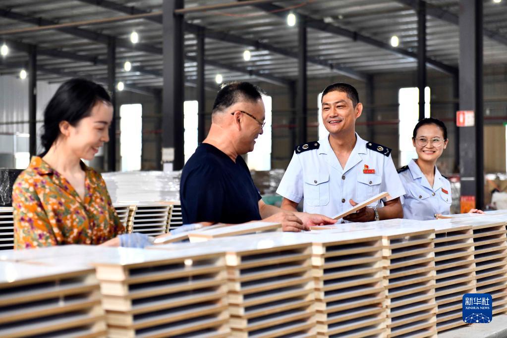 2021年6月16日,在菏澤金然木制品有限公司,山東省菏澤市曹縣稅務局的工作人員上門走訪,介紹出口退稅相關優惠政策。新華社記者 郭緒雷 攝