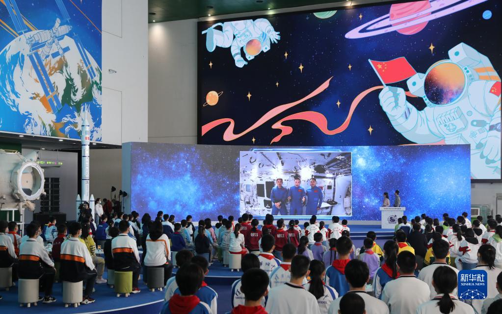 2021年12月9日,“天宮課堂”第一課開課,神舟十三號乘組航天員翟志剛、王亞平、葉光富在空間站進行太空授課。這是學生們在北京中國科技館聽課。新華社記者 金立旺 攝