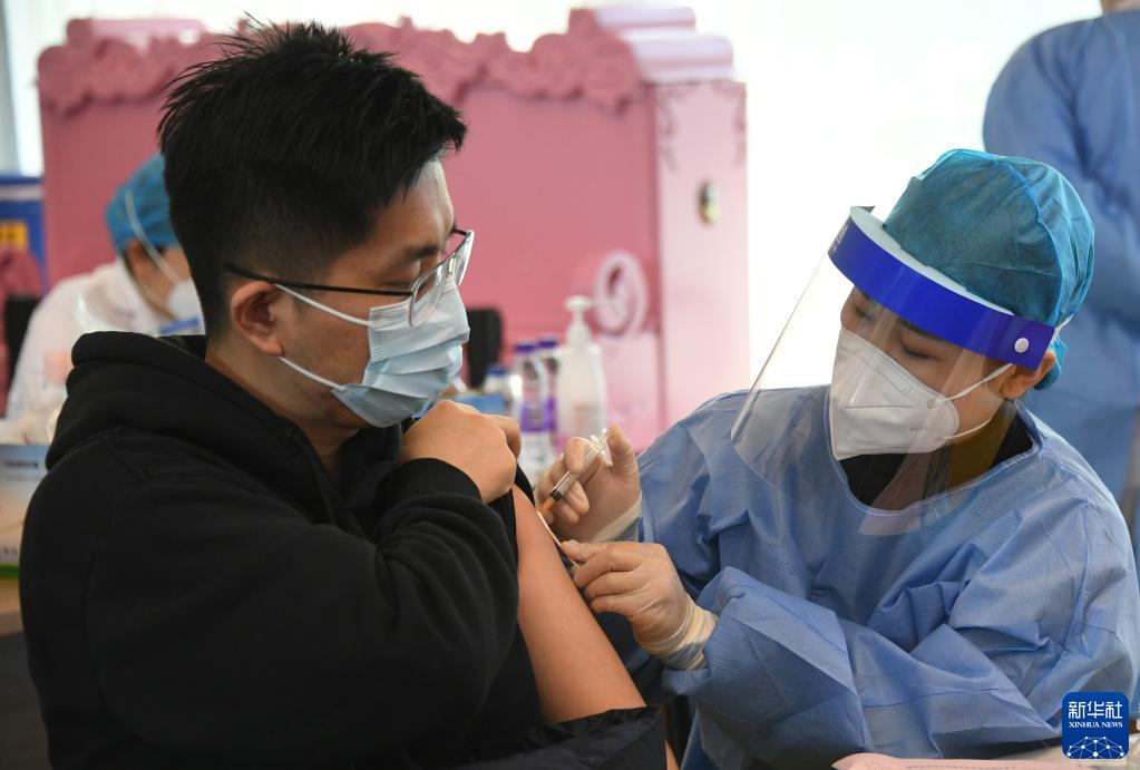 2021年12月7日,北京市海淀區上地街道組織醫護人員來到海國瑞業科技園,為園區內的企業員工進行新冠疫苗加強針接種。新華社記者 任超 攝