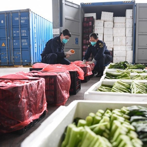 2月21日,在深圳大鏟灣碼頭,深圳海關工作人員查驗供港蔬菜。新華社記者 梁旭 攝