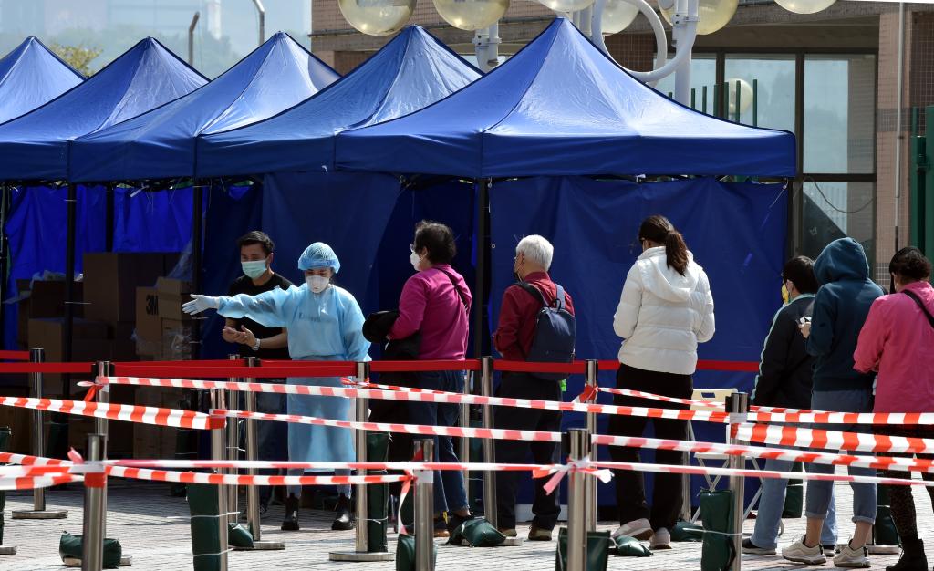 2月27日,在香港青衣流動檢測站,市民排隊進行核酸檢測。新華社記者 盧炳輝 攝