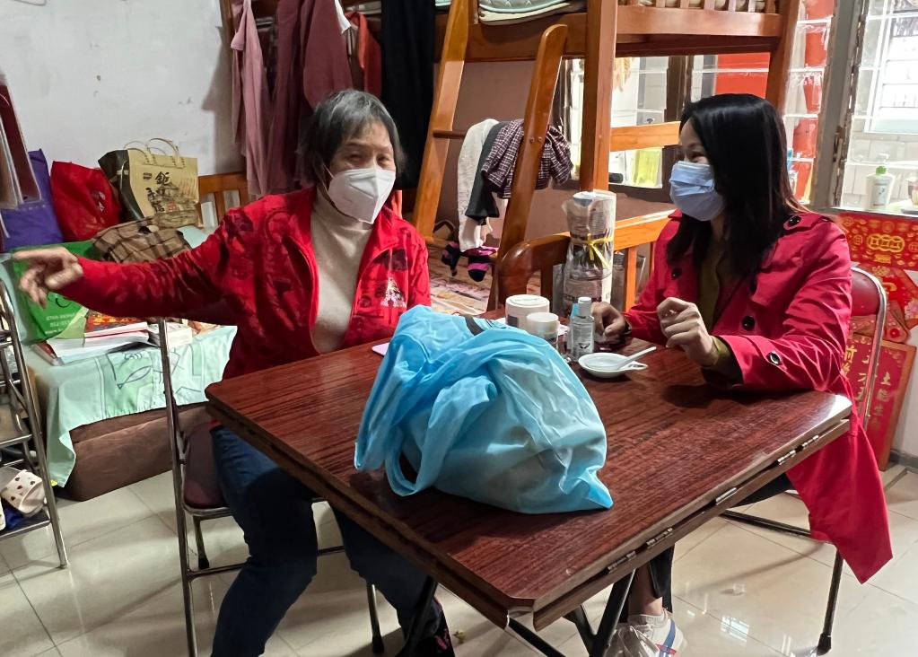 義工傅順芳(右)到市民家中派送防疫物資(資料照片)。新華社發