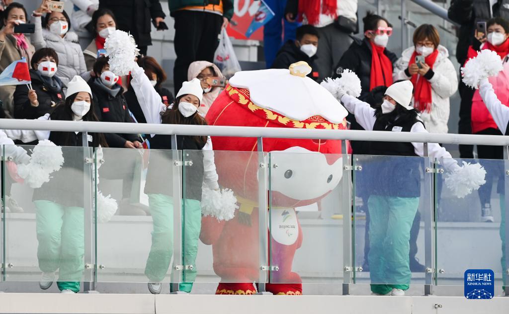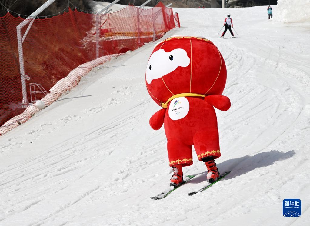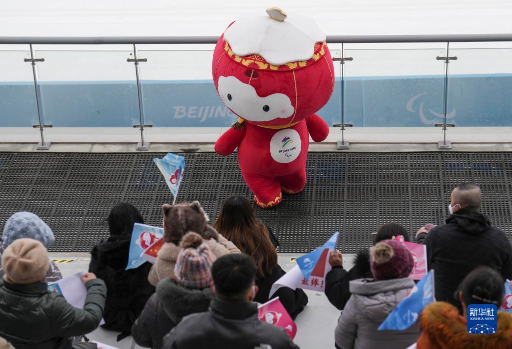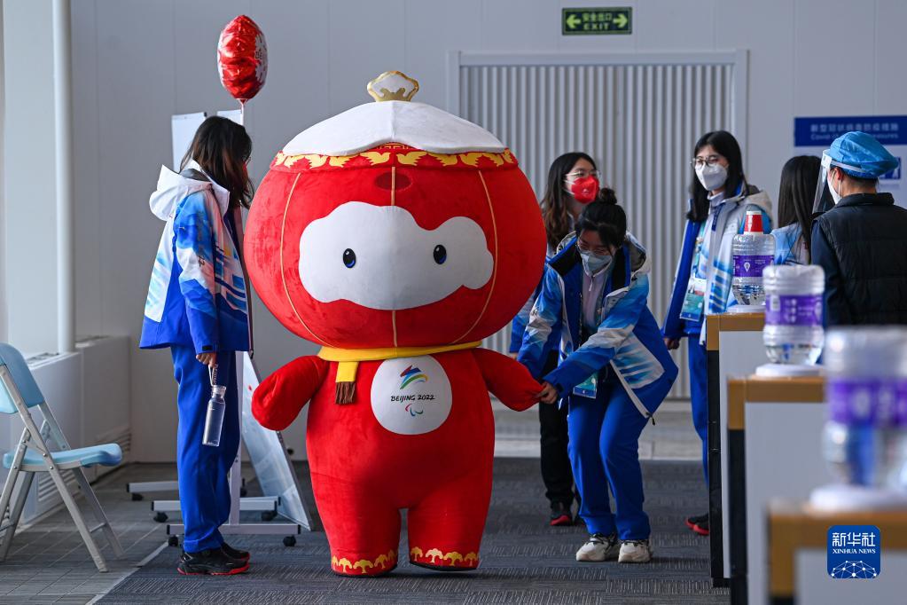 在國家冬季兩項中心,“雪容融”參與賽前表演,活躍氣氛(3月9日攝)。