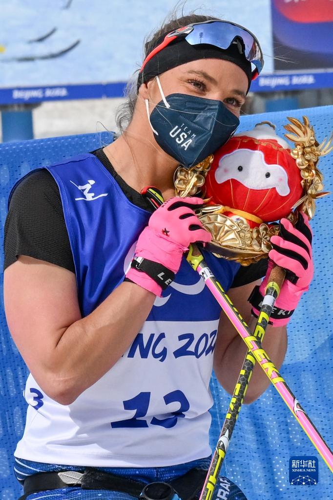 獲得殘奧越野滑雪女子短距離(坐姿)比賽亞軍的美國選手奧克薩娜·馬斯特斯展示“雪容融”(3月9日攝)。新華社記者 李博 攝