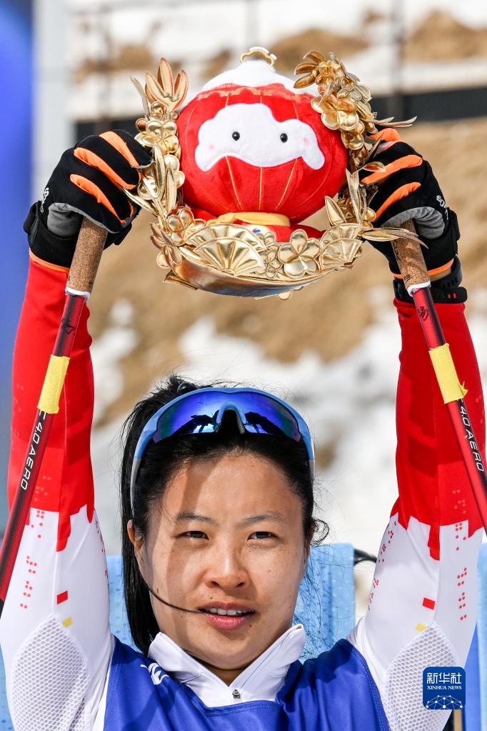 獲得殘奧越野滑雪女子短距離(坐姿)比賽冠軍的中國選手楊洪瓊高舉“雪容融”慶祝(3月9日攝)。新華社記者 李博 攝