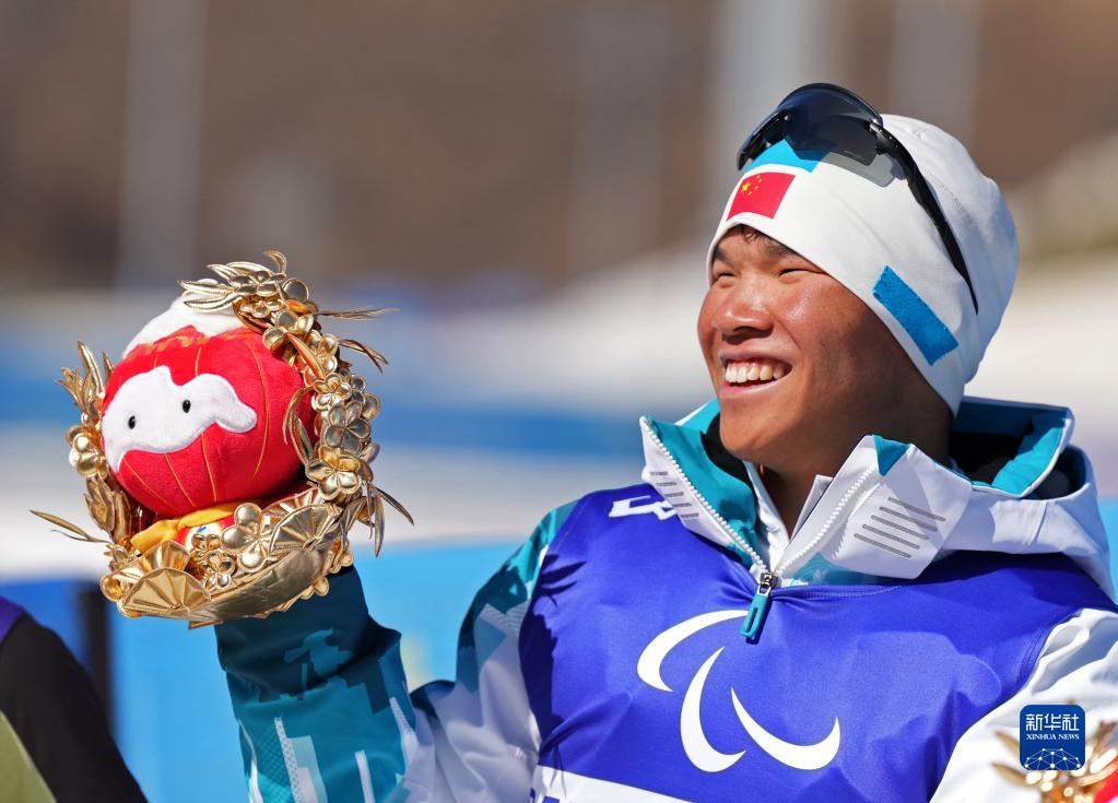 獲得殘奧冬季兩項男子中距離(坐姿)比賽冠軍的中國選手劉夢濤展示“雪容融”(3月8日攝)。新華社記者 萬象 攝