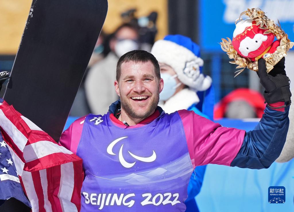 獲得殘奧單板滑雪男子障礙追逐LL1級比賽亞軍的美國選手邁克·舒爾茨展示“雪容融”(3月7日攝)。新華社記者 萬象 攝?