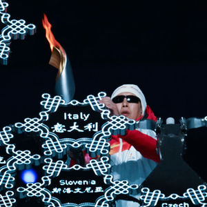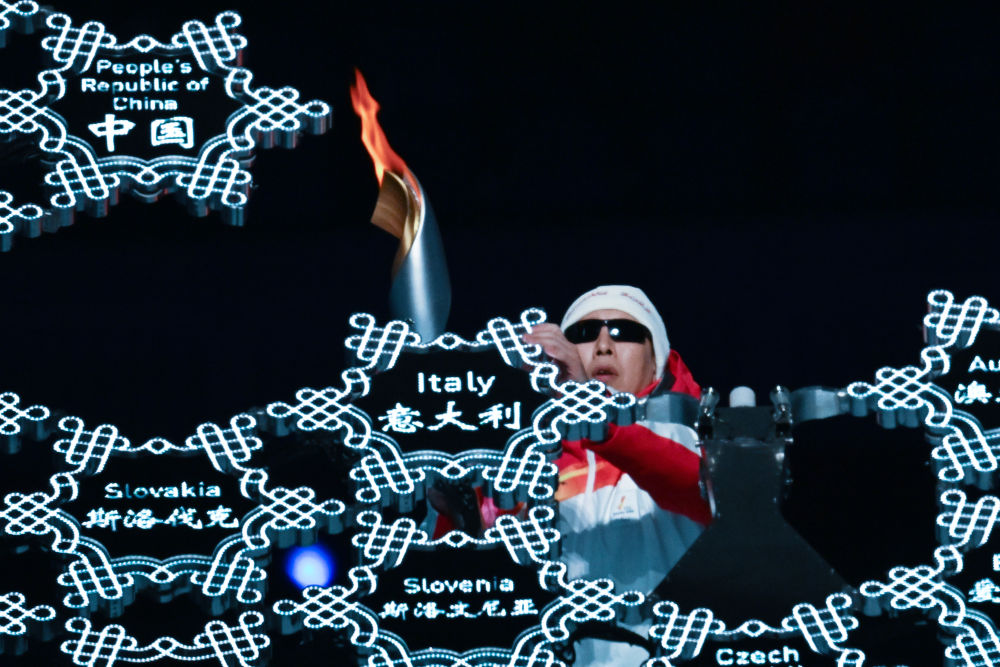 ↑3月4日晚,北京2022年冬殘奧會開幕式在北京國家體育場舉行。這是最后一棒火炬手李端摸索火炬嵌入的位置。新華社記者 李尕 攝