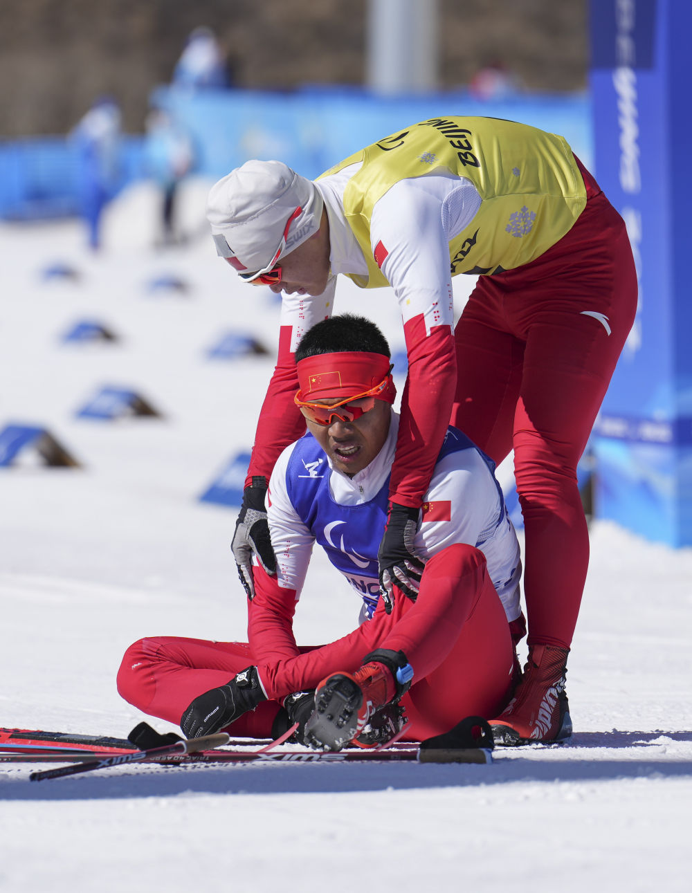 ↑3月7日,在張家口舉行的殘奧越野滑雪男子長距離傳統技術(視障)比賽后,引導員刁程國(上)鼓勵中國選手許賀。視障運動員參與殘奧越野滑雪、殘奧冬季兩項和殘奧高山滑雪比賽時,須在引導員的幫助下,合力完成。他們共同追逐夢想、挑戰自我,分享快樂和榮譽。新華社記者 胡虎虎 攝