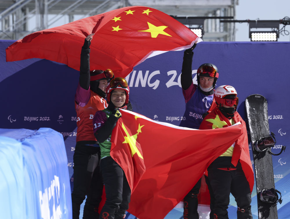 ↑3月7日,獲得季軍的中國選手朱永鋼(后左)、冠軍紀立家(后右)、亞軍王鵬耀(前左)和隊友張義琦在殘奧單板滑雪男子障礙追逐(UL級)比賽后慶祝。決賽中,所有四名參賽選手都來自中國。他們改變了中國在冬殘奧會殘奧單板滑雪項目沒有獎牌的歷史。決賽后,四名選手全部將五星紅旗披在身上。那一天,云頂的陽光特別亮,陽光和雪地映襯下的五星紅旗格外顯眼。新華社記者 蘭紅光 攝