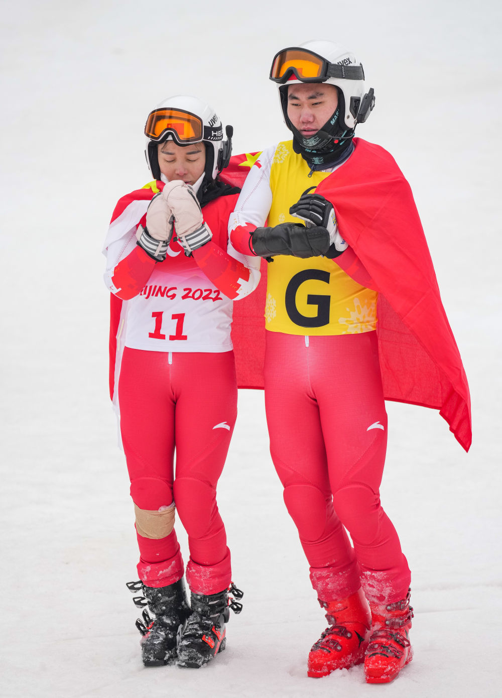 ↑3月11日,在北京延慶國家高山滑雪中心舉行的殘奧高山滑雪女子大回轉(視障)比賽后,獲得亞軍的中國選手朱大慶(左)和引導員閆寒寒身披國旗,并肩站在一起。朱大慶在上午第一輪比賽中摔到頭部,但在下午比賽中依舊堅持帶傷上陣,最終獲得銀牌。其實,早在殘奧會開幕前,朱大慶已傷到顱腦,她依舊參加了多項比賽。新華社記者 孫非 攝