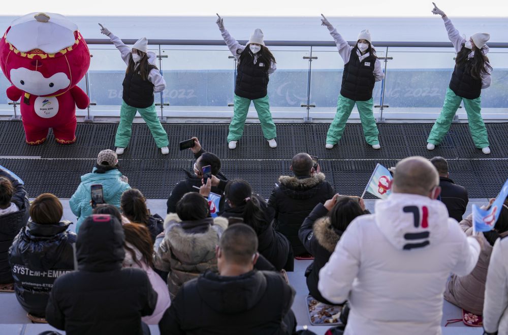 ↑3月8日,在張家口國家冬季兩項中心舉行的殘奧冬季兩項女子短距離自由技術(視障)決賽前,學生們在表演啦啦操。他們是最“安靜”卻最能點燃賽場觀賽情緒的“氣氛組”。組里的12名青少年是張家口市特殊教育學校聽障學生,年齡最小的14歲,最大的20歲。他們身處“無聲”世界,卻用極富韻律的啦啦操溫暖整個賽場。新華社記者 胡虎虎 攝