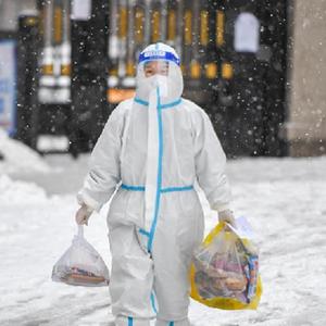 3月15日,吉林省吉林市昌邑區興華街道中興社區網格員宋冉為隔離居民運送生活物資。新華社記者 張楠 攝