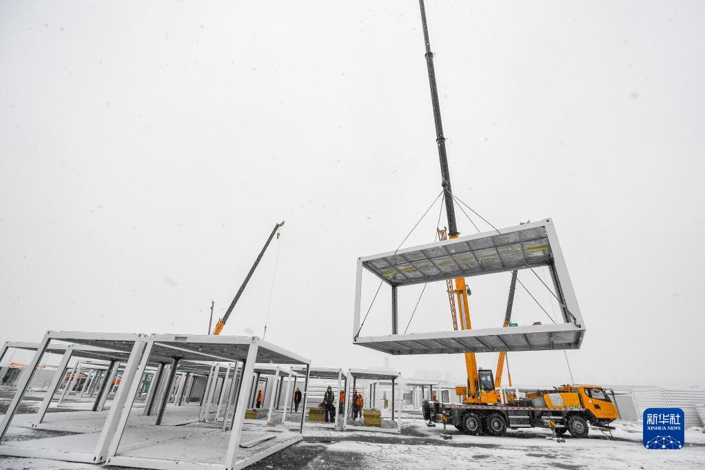 惡劣的天氣,阻擋不了“中國速度”。施工現場,各種大型機械馬力全開,正火速把一個個公共汽車大小的白色方艙有序組合起來。