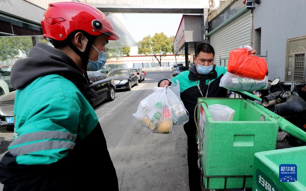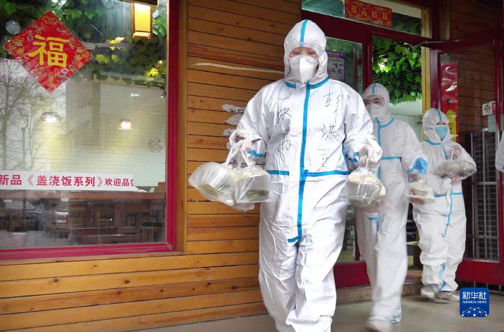 3月12日,山東青島萊西市“一塊幫”青年志愿者為一線抗疫人員取餐配送(視頻截圖)。新華社發