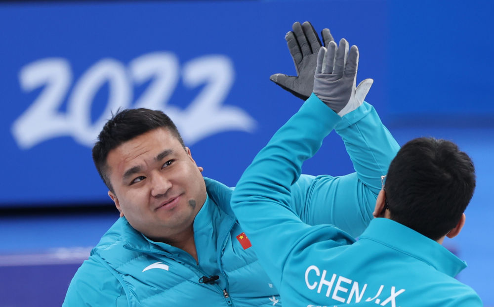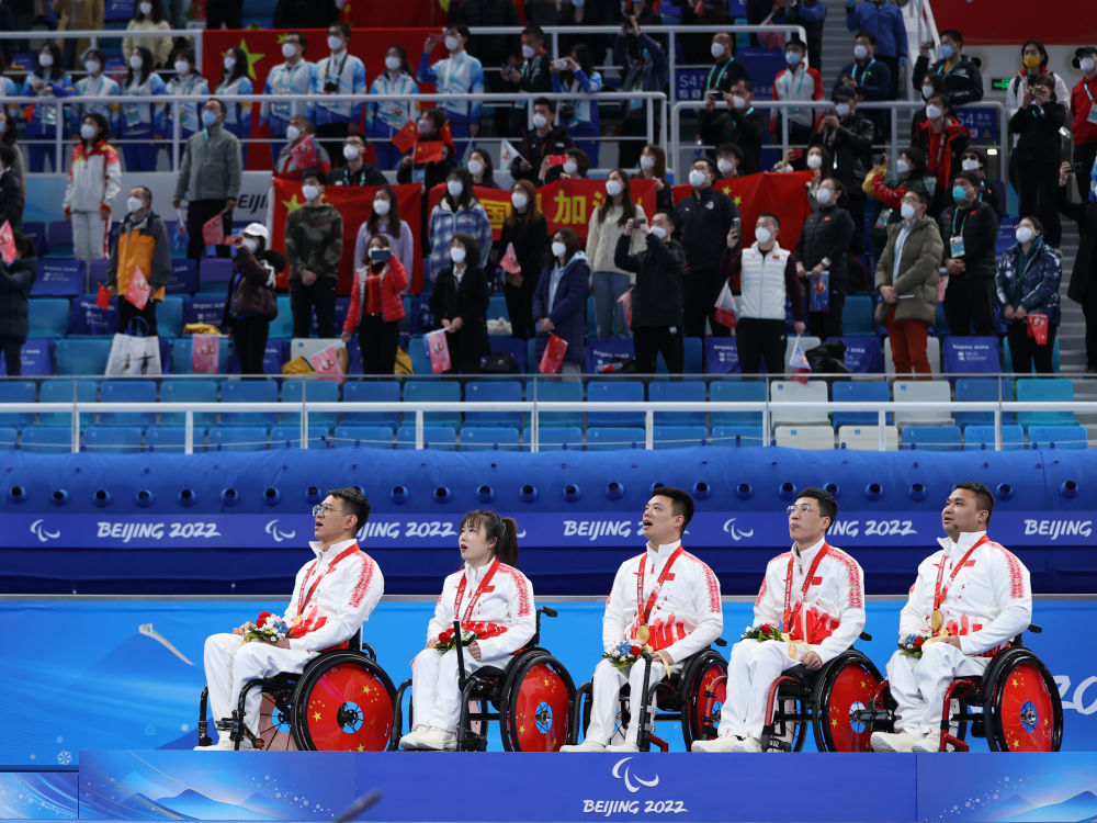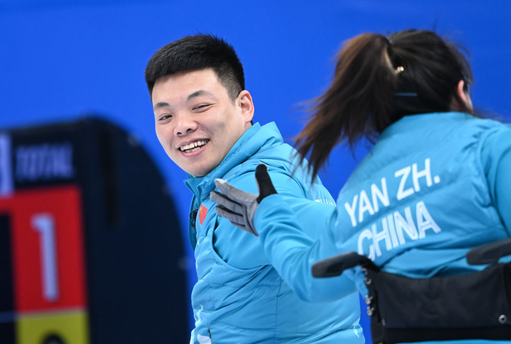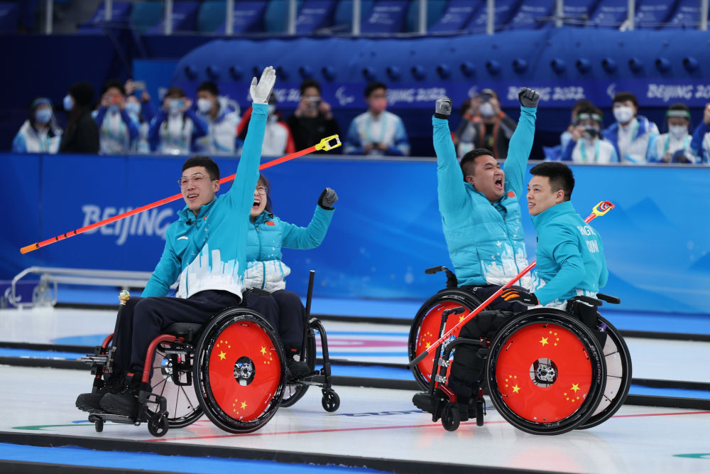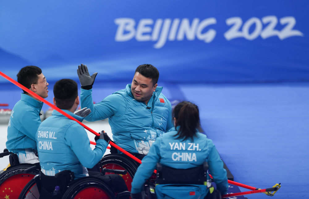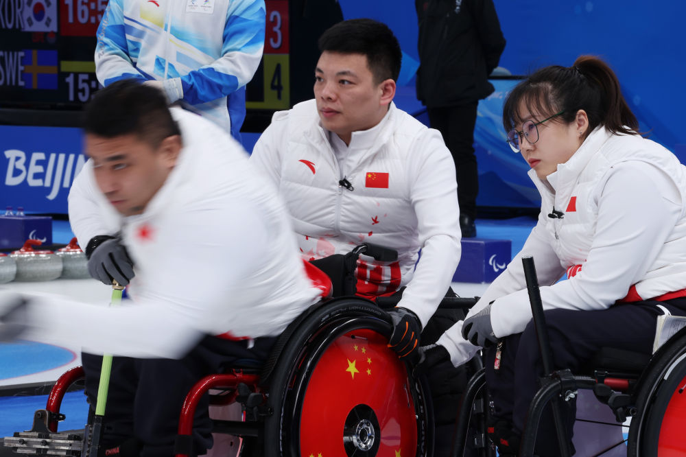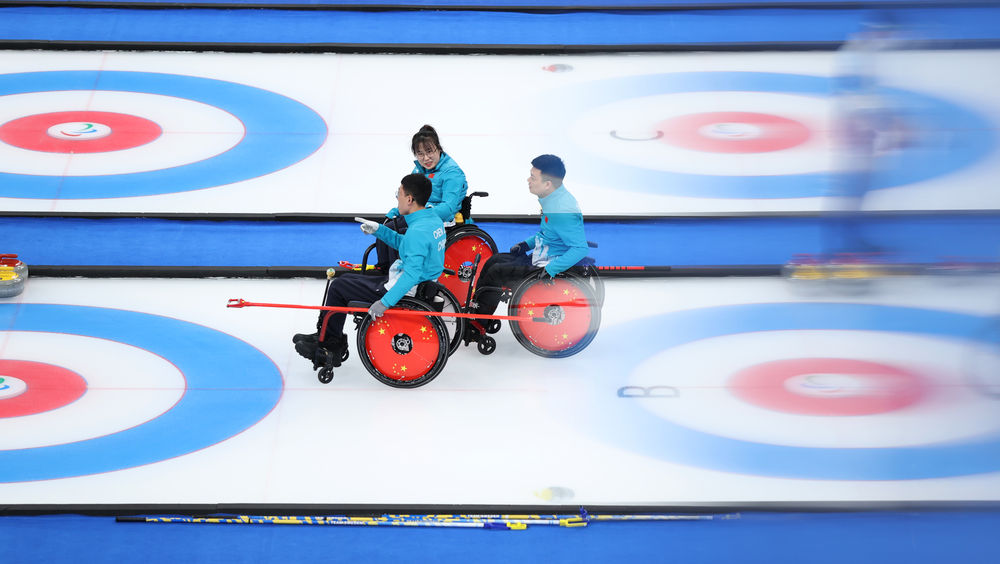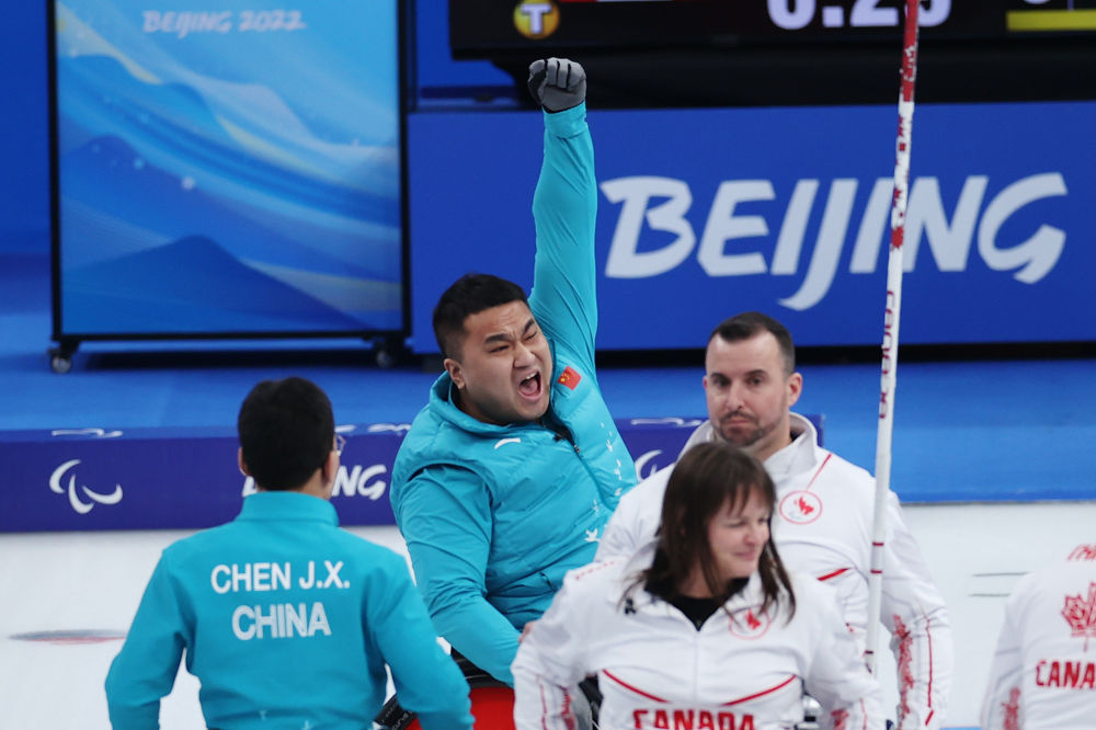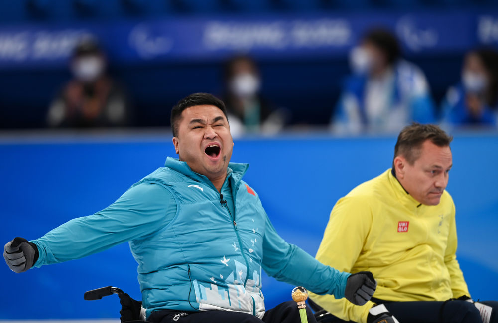 3月12日,北京冬殘奧會輪椅冰壺金牌賽第七局結束,中國隊以8比3領先,勝券在握。