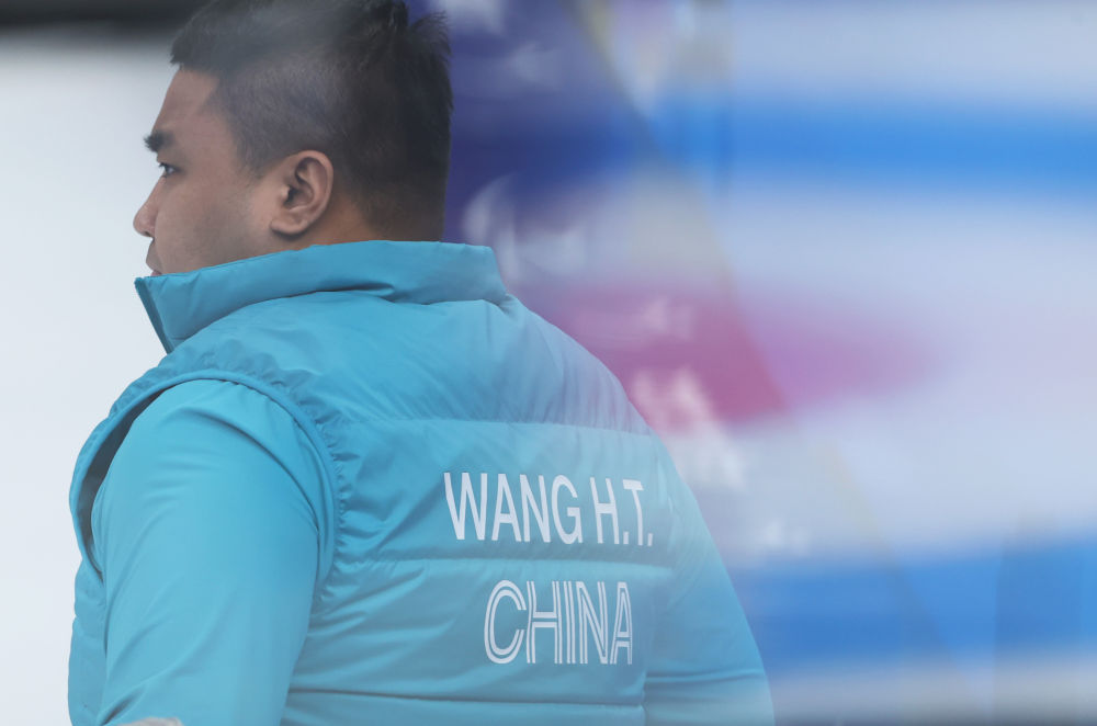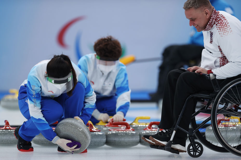 ↑3月6日,中國隊選手閆卓(右)在輪椅冰壺循環賽中協助隊友張明亮穩定輪椅。