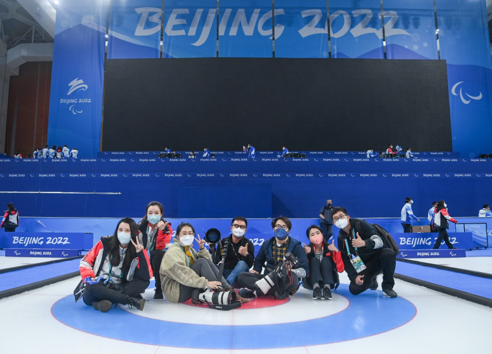 ↑3月12日,輪椅冰壺所有比賽結束后,輪椅冰壺攝影小組和場館攝影經理在賽場上合影留念。