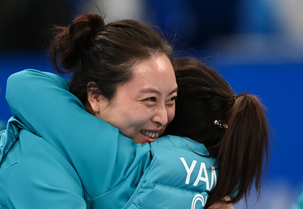 ↑3月12日,中國輪椅冰壺隊教練岳清爽(左)在比賽后落淚。