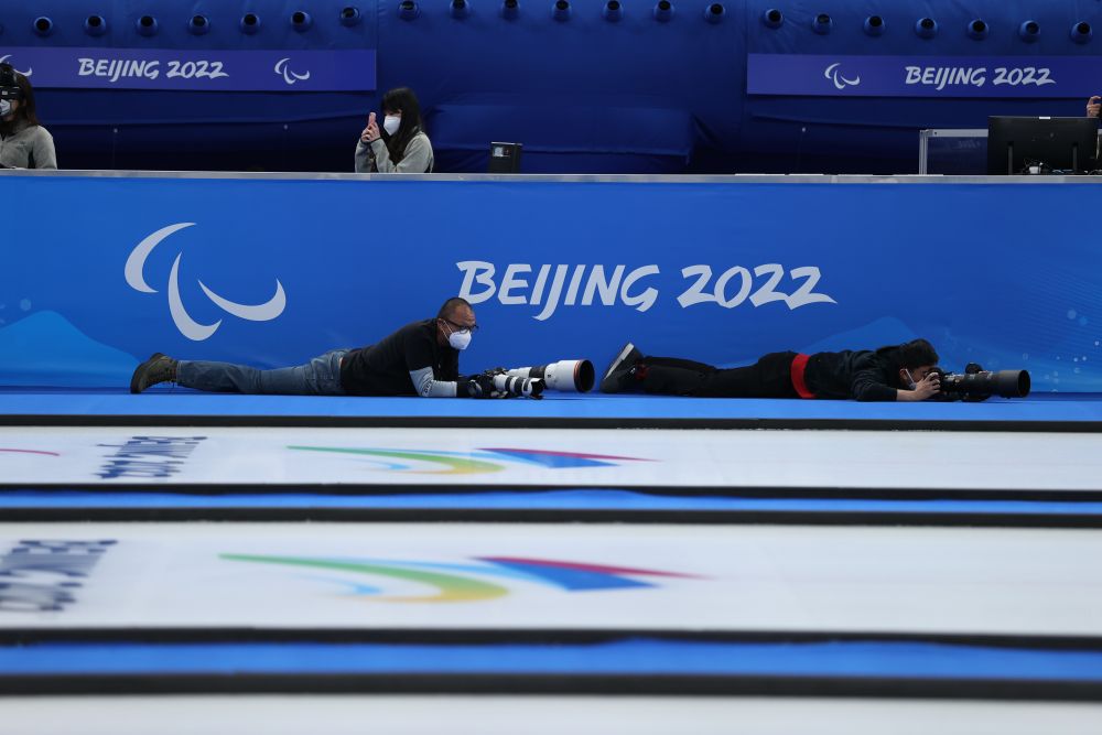 ↑新華社記者任超(前右)在Pool中進行輪椅冰壺金牌賽的拍攝(3月12日攝)。新華社記者 杜瀟逸 攝。