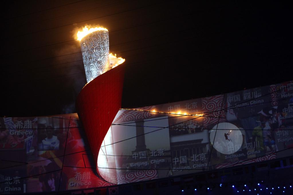答:那時候征集了很多點火方案,我記得全民征集、全國征集,他們給我辦公室里擱了幾大麻袋收集來的方案。我就整理拆開看,成千上萬條點火方案,全民熱情很高。后來我們自己選擇了這樣一個競技狀態的點火,利用“鳥巢”的“碗邊”,400米的一個環繞,很像一個跑道。李寧離地60米在上頭“飛”,更快、更高、更強,做一個奔跑者。他代表著中國人的一個形象,大步奔向未來。他身后是傳遞火炬的畫卷,畫卷環環打開,像夸父逐日一樣,在飛奔著追逐光明。