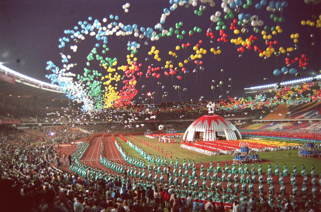 圖為1990年9月22日,第十一屆亞運會開幕式在北京工人體育場舉行。新華社記者何惠飛攝