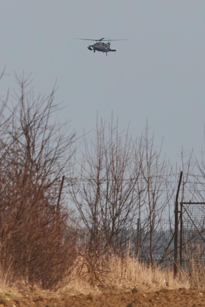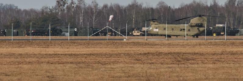 記者又驅車前往熱舒夫西北部60多公里處的梅萊茨機場。駛近機場就看到黑鷹直升機低空盤旋。在這座面積并不大的機場外,排隊停著十多輛油罐車,準備提供燃油供給。機場附近,兩名荷槍實彈的美軍士兵把守著一座美軍軍營。從外圍可以看到機場里??恐鴶导芎邡椫鄙龣C和奇努克運輸直升機。