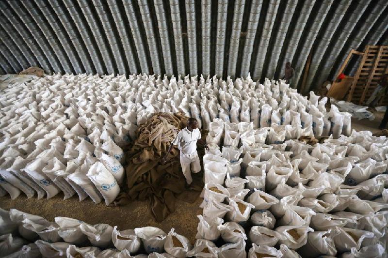 2017年3月2日,在肯尼亞桑布魯郡的馬臘拉爾鎮,一名官員查看救濟糧。新華社記者潘思危攝