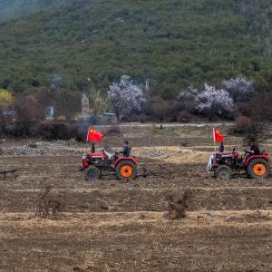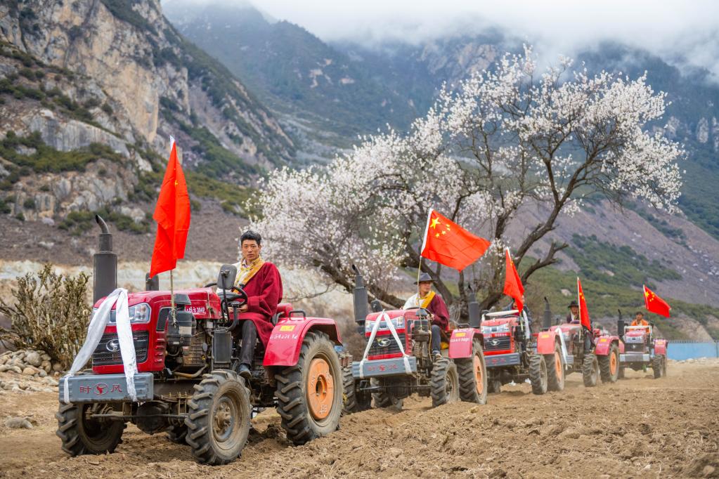 扎西崗村海拔3100多米,全村44戶214人,祈求糧食豐收的春耕儀式,是當地重要的民俗活動。只見一臺臺掛著五星紅旗和潔白哈達的拖拉機,緩緩駛入田間。白瑪才旺換上節日的盛裝,發動拖拉機加入春耕儀式的隊伍。