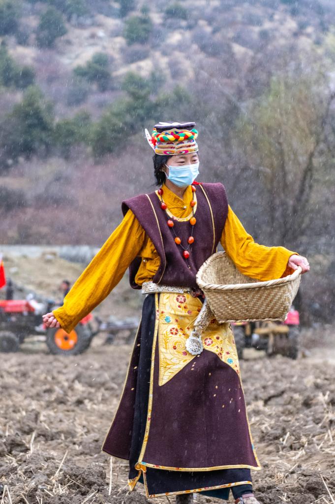 村民仁增旺姆是當天春耕活動的主角,負責引領春耕隊伍前行。盡管田間泥濘,但她著裝華麗。