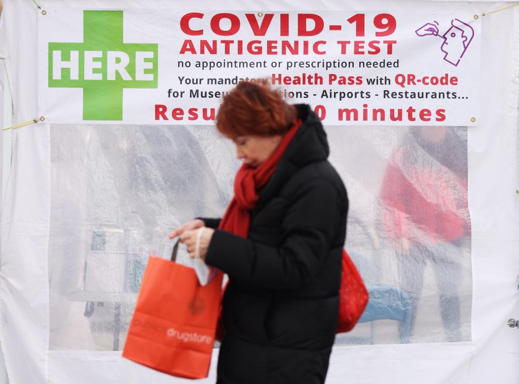 2021年12月23日,在法國巴黎香榭麗舍大街,一名女子拎著購物袋走過一處新冠病毒快速檢測點。新華社記者高靜 攝