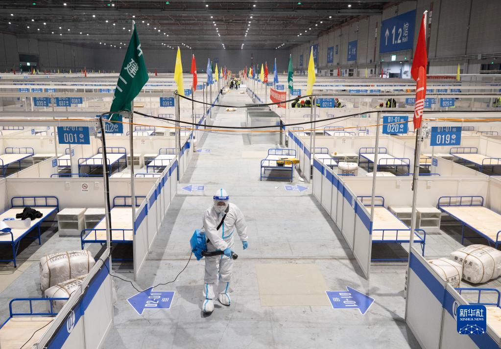 4月8日,工作人員在國家會展中心(上海)方艙醫院進行消殺處理。新華社記者 金立旺 攝