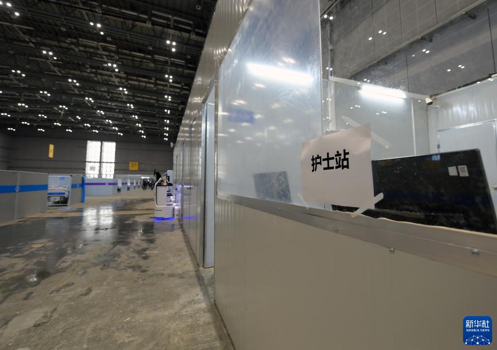 4月9日,完工交付的“四葉草”方艙醫院3號館內即將投入使用的護士站。新華社記者 李賀 攝