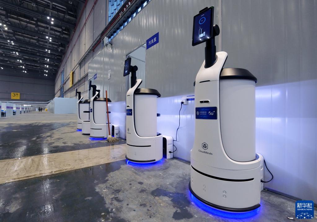 4月9日,在完工交付的“四葉草”方艙醫院3號館內,云端智能服務機器人已經就位,即將為收治在這里的病患提供多種服務。新華社記者 李賀 攝