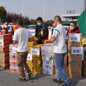 上海交通部門、上海市交通運輸行業協會集裝箱分會聯合上海市慈善基金會為集卡司機提供食物。 新華社記者王辰陽 攝