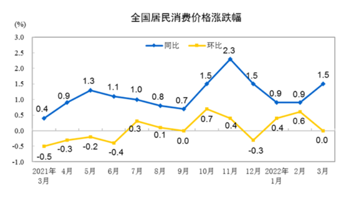 不過,3月份以來,受國內多點散發疫情和國際大宗商品價格上漲等因素影響,CPI同比漲幅有所擴大。3月份CPI同比上漲1.5%,漲幅比上月擴大0.6個百分點。此外,部分民生商品價格漲幅較大,如鮮菜價格由上月同比下降0.1%轉為上漲17.2%。